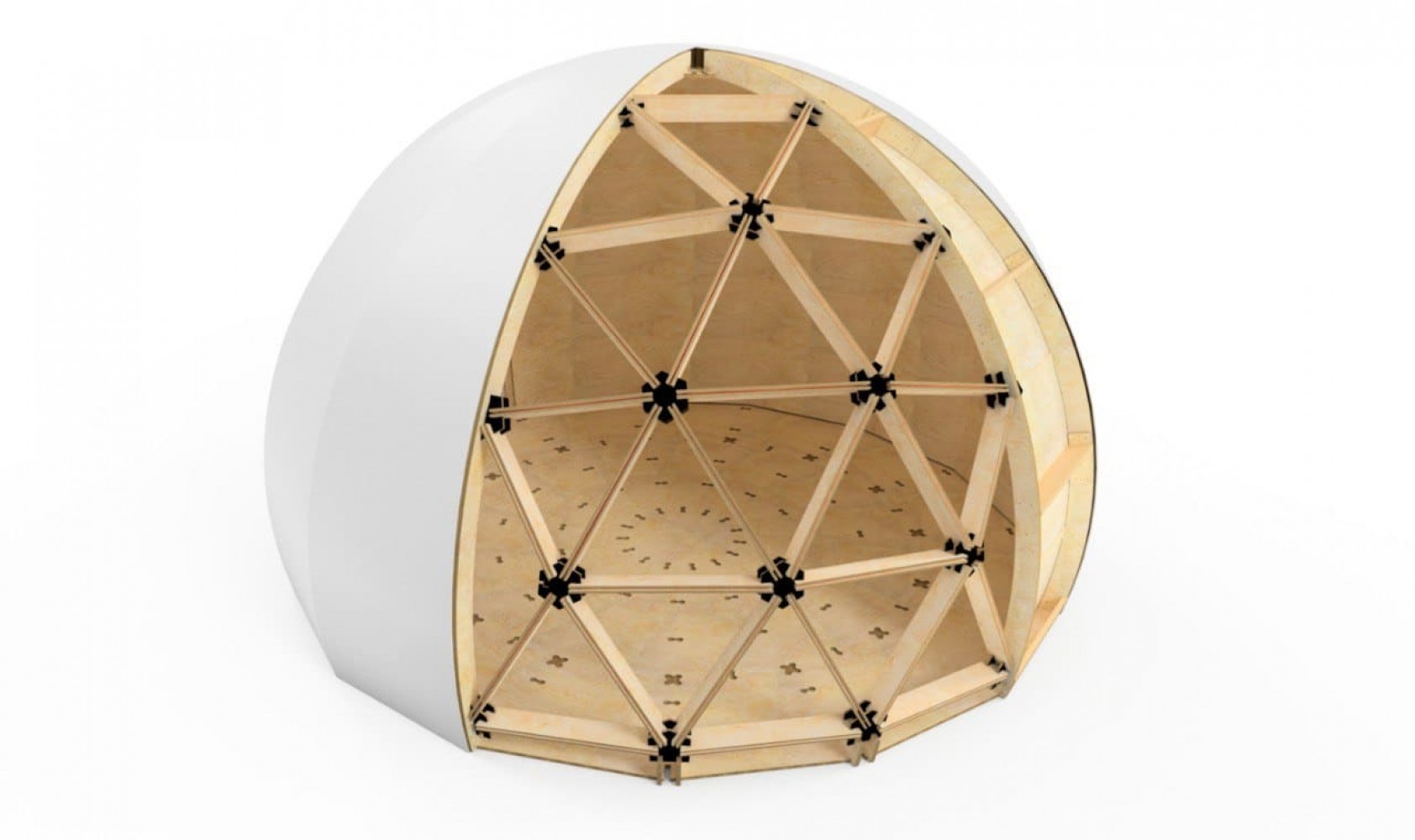 Конструктор каркаса геодезического купольного дома на 21 квадратных метра на фанерных коннекторах для самостоятельной сборки по инструкции.